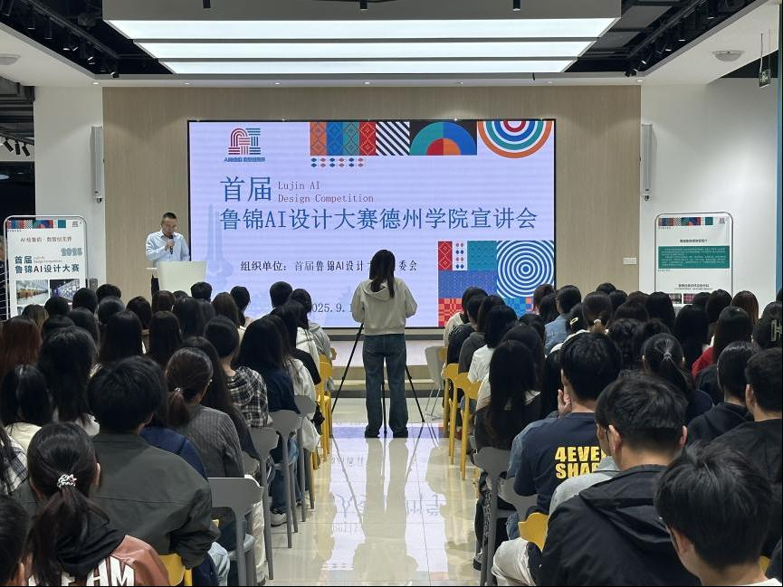 宣讲会由山东纺织工程学会秘书长孙继科主持,纺织服装学院主要负责人致开幕词。会上,山东纺织工程学会副理事长曲延国对比赛流程、参赛要求、评审标准及奖项设置等事项进行了系统解读;乙盟信息技术有限公司技术专家卢胜书以“人工智能辅助鲁锦设计”为主题,介绍了AI生成图像、风格迁移、图案优化等基本技巧;纺织服装学院第三教师党支部书记以“非遗在我们身边,鲁锦设计创新思路探讨”为题作专题讲解,从鲁锦纹样构成、色彩寓意、工艺特点等方面深入剖析鲁锦的艺术内涵,阐释其在纺织史上的技术价值与传承意义。